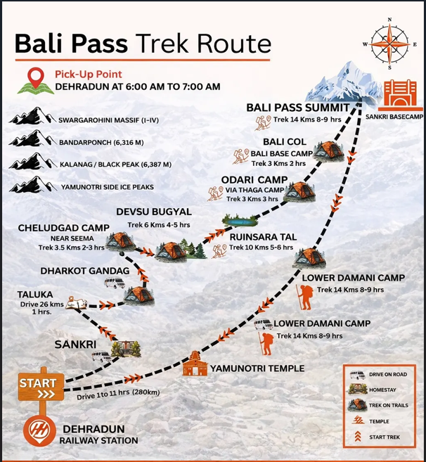 Bali Pass Trek lies at the height Altitude of 4953 Meters. The Bali Pass Trek starts from Sankri Base Camp, which is the base camp of more than twenty-five Treks In Uttarakhand, and Ends at Trek Yamunotri Jankichatti.